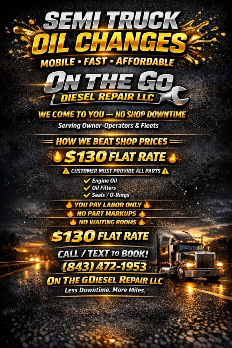On The Go Diesel Repair & Logistics is a locally owned mobile diesel repair company serving Upstate South Carolina. We offer 24/7 roadside diesel repair, on-site truck service, and logistics support throughout Greenville, Spartanburg, Greer, Duncan, and along the I-85 corridor. Our mobile diesel mechanic services include semi-truck repair, trailer repair, diagnostics, batteries, tires, and emergency breakdown response.